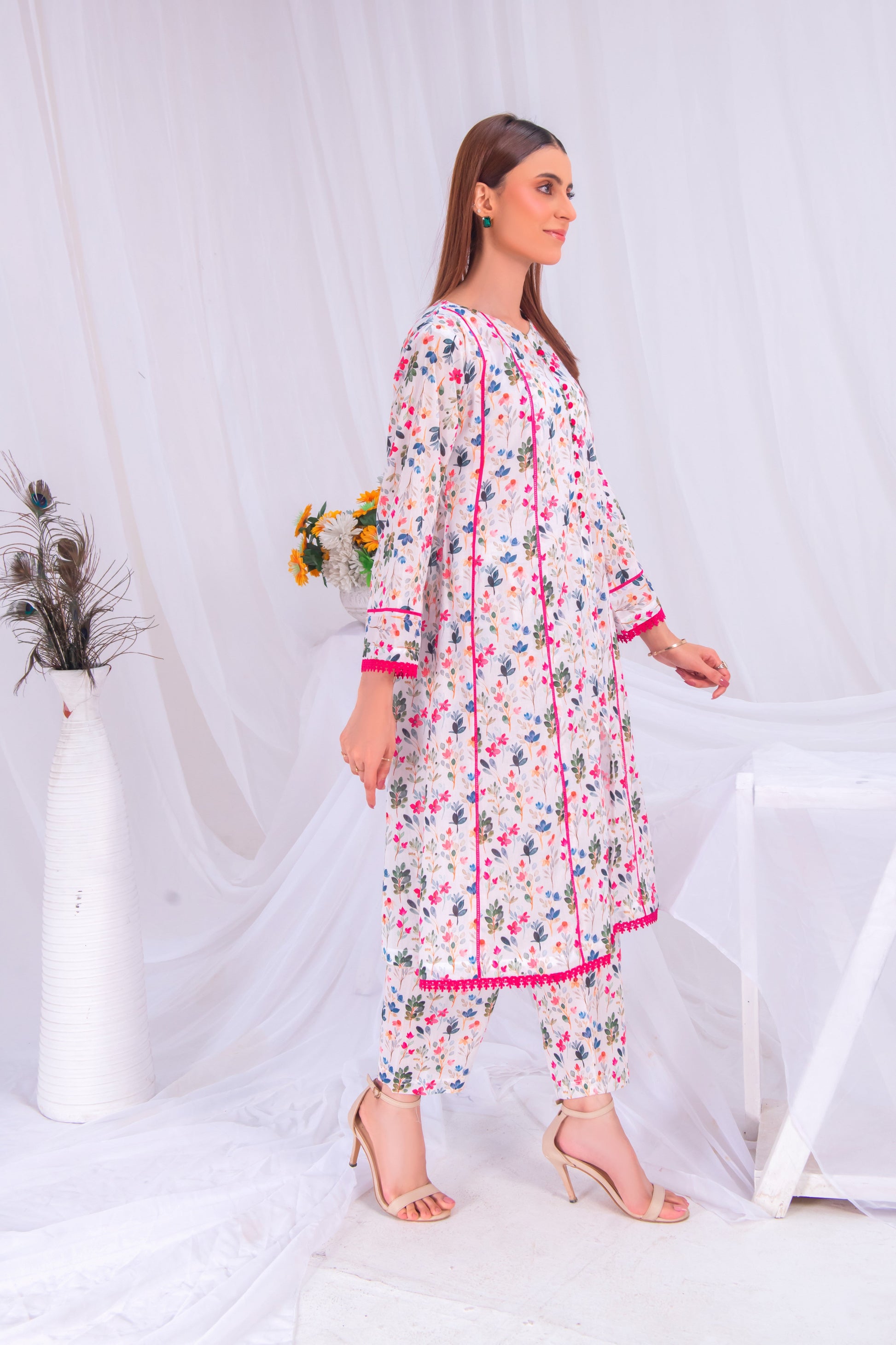 Crafted from premium lawn fabric, this suit feels as light and breezy as a summer day. The crisp white base provides the perfect backdrop for the whimsical blue florals, creating a look that's both elegant and fun.