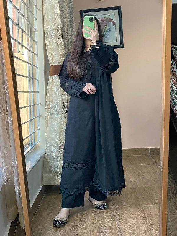 Discover timeless elegance with our Soft Khaddar Dress. Featuring a beautifully detailed neckline with lace & Button detailing, this outfit exudes sophistication. The lace continues on the sleeves & Daman adding charm to the self-design khaddar fabric. Paired with tailored-fit trousers and a pure chiffon dupatta with lace accents, it's the perfect blend of style and comfort for winter.