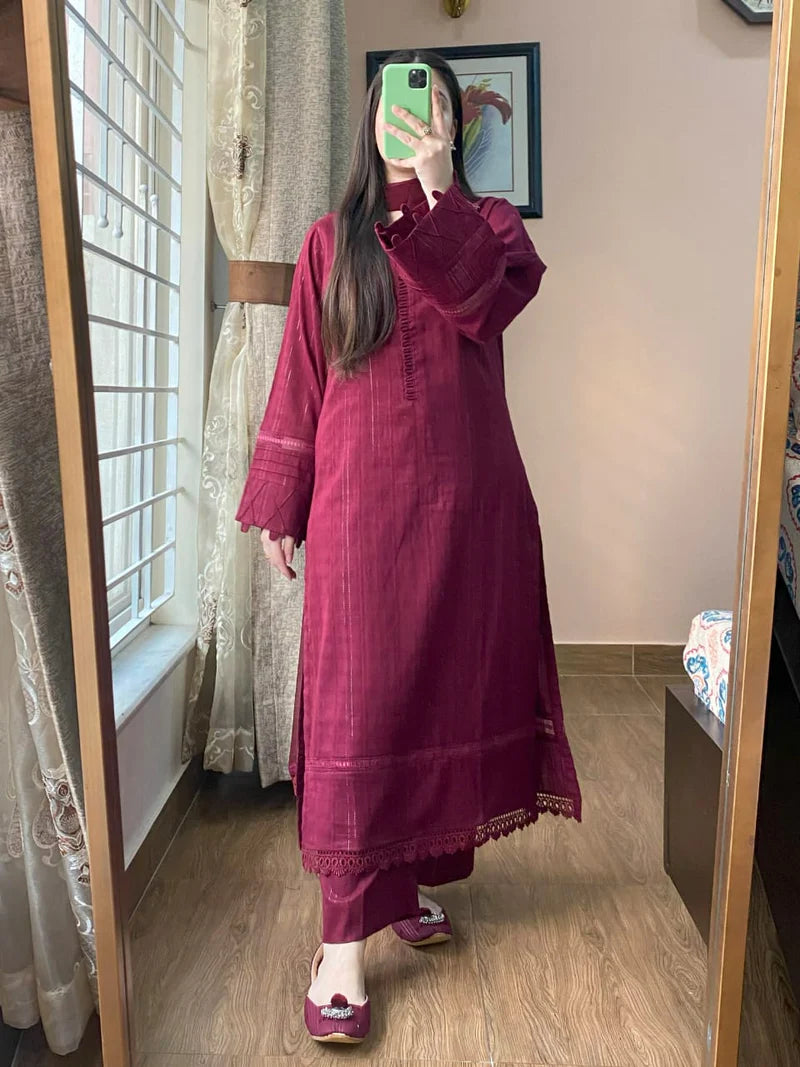Upgrade your wardrobe with this stunning 3-piece cambric suit. The shirt boasts lace details on the sleeves and neckline, enhanced by buttons for a touch of sophistication. The straight-fit trouser offers comfort and style, while the chiffon dupatta with lacework completes the look with a delicate, feminine touch.
