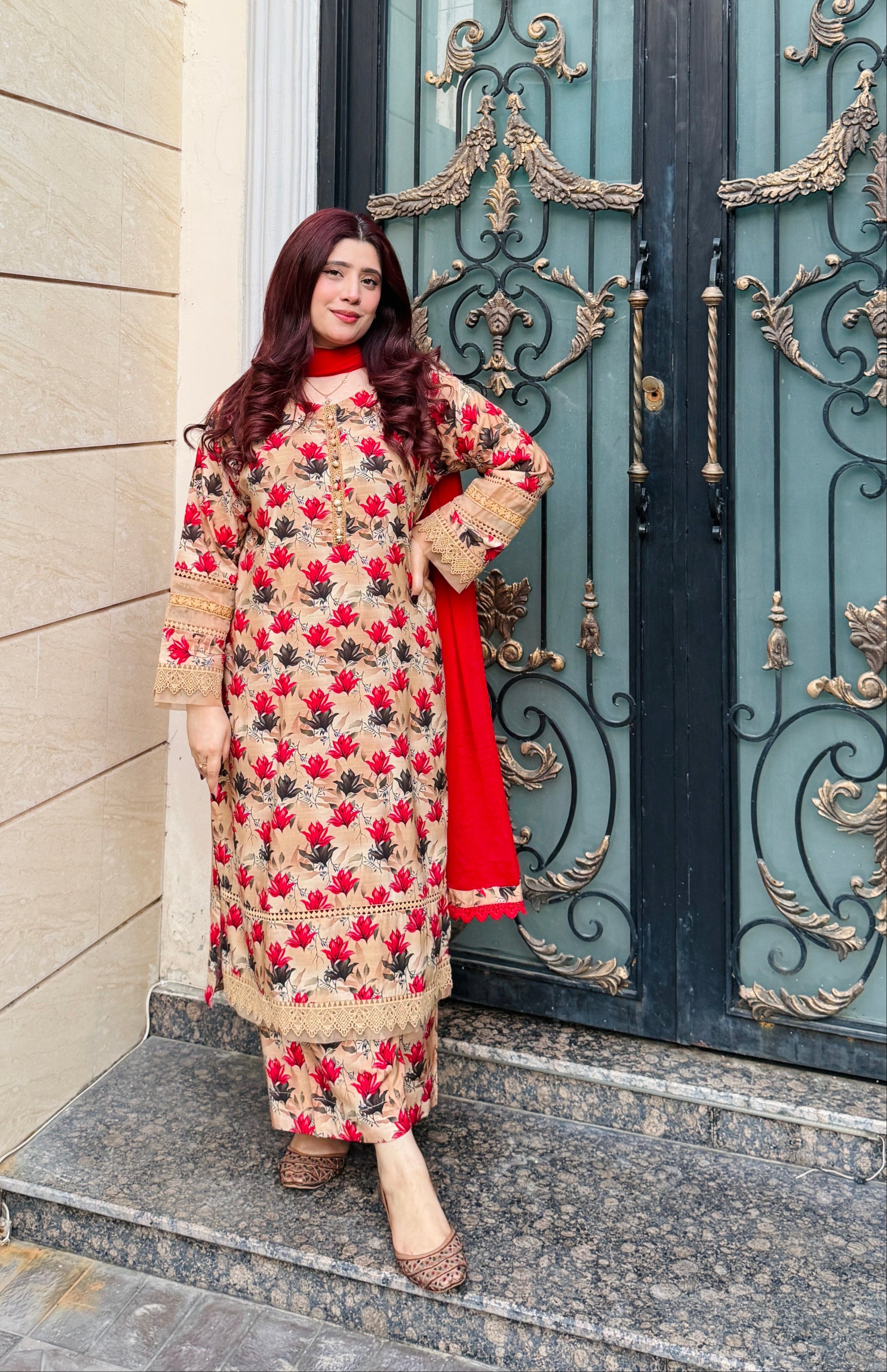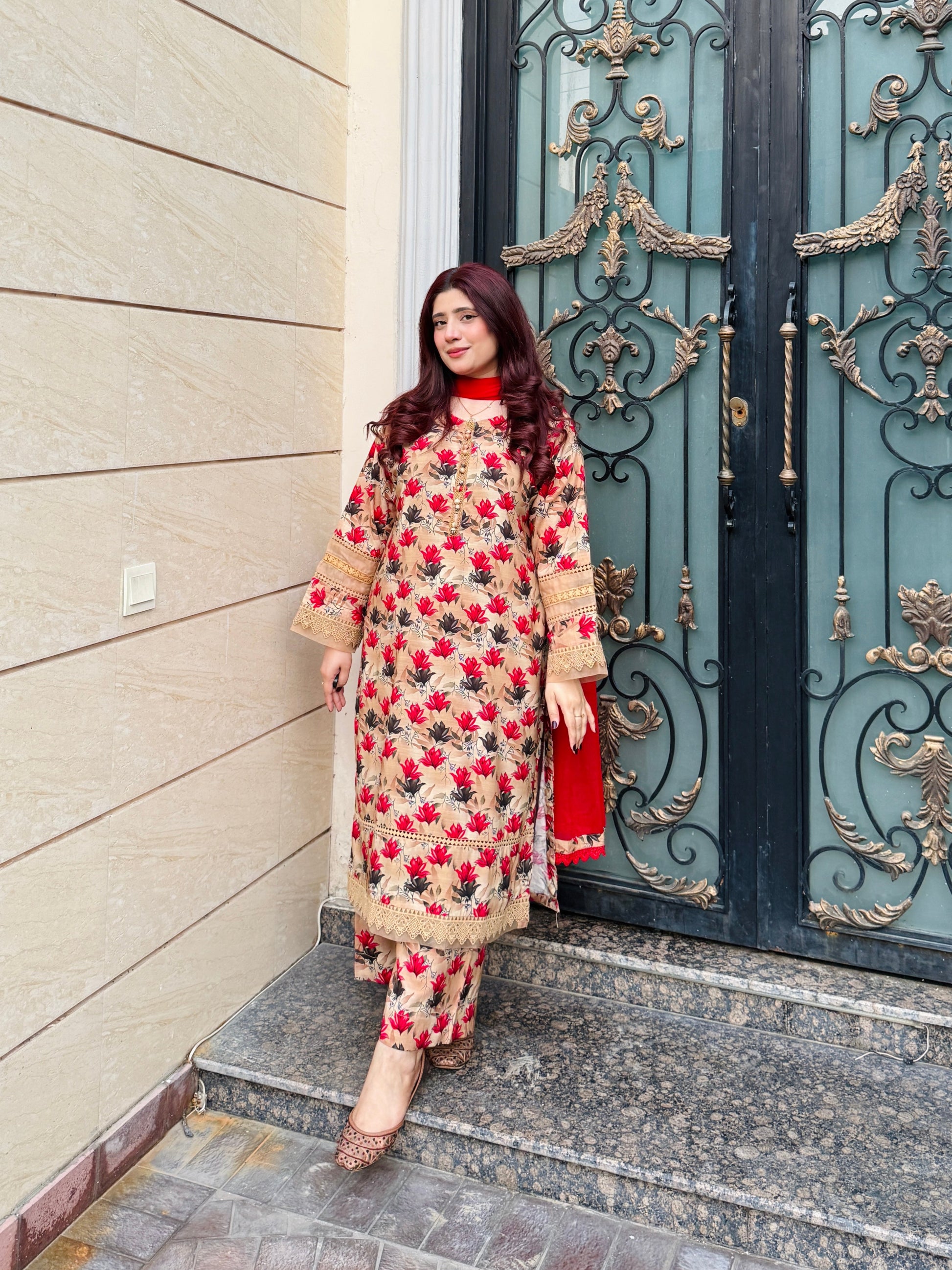 3-PIECE- Slub Lenan Winter Stitched Dress