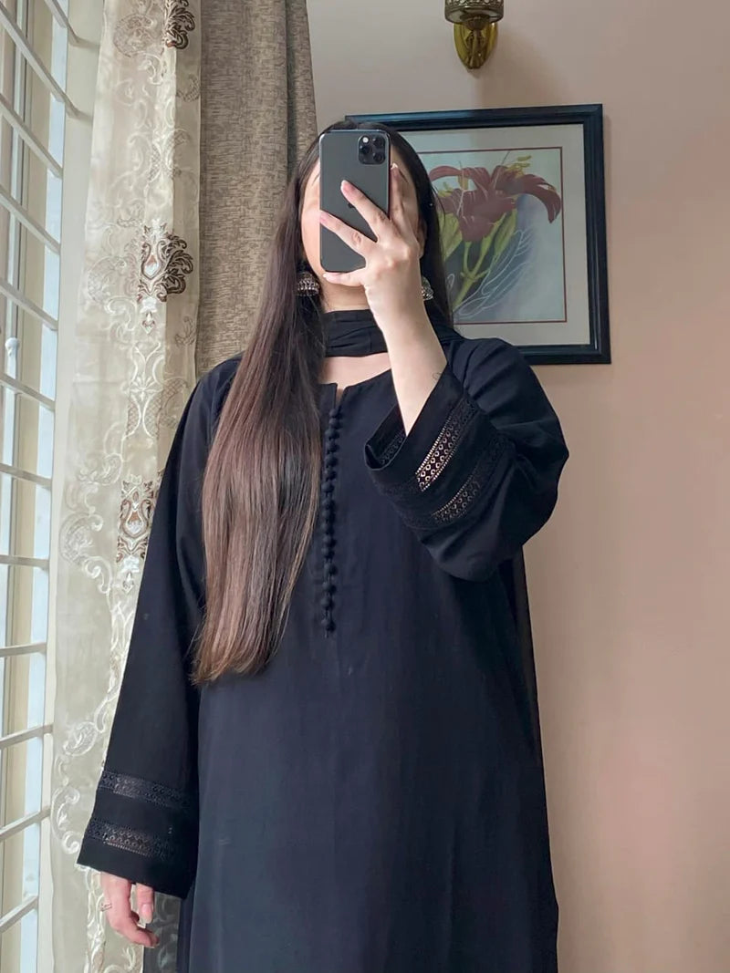 - Shirt: Tailored from premium Plain Khaddar , featuring lacework on the sleeves and daman (hem), with buttons on the neckline for a delicate, detailed finish.