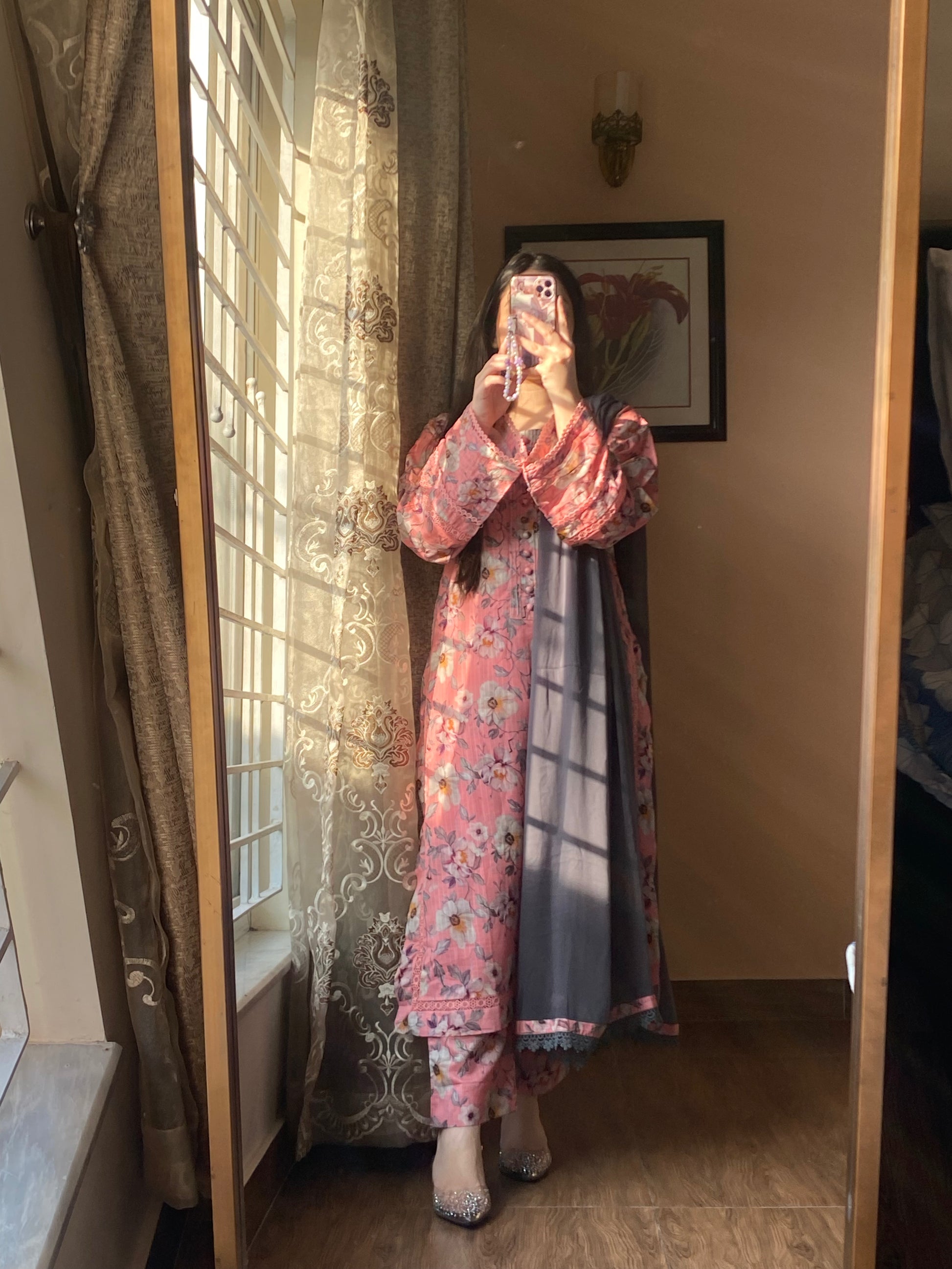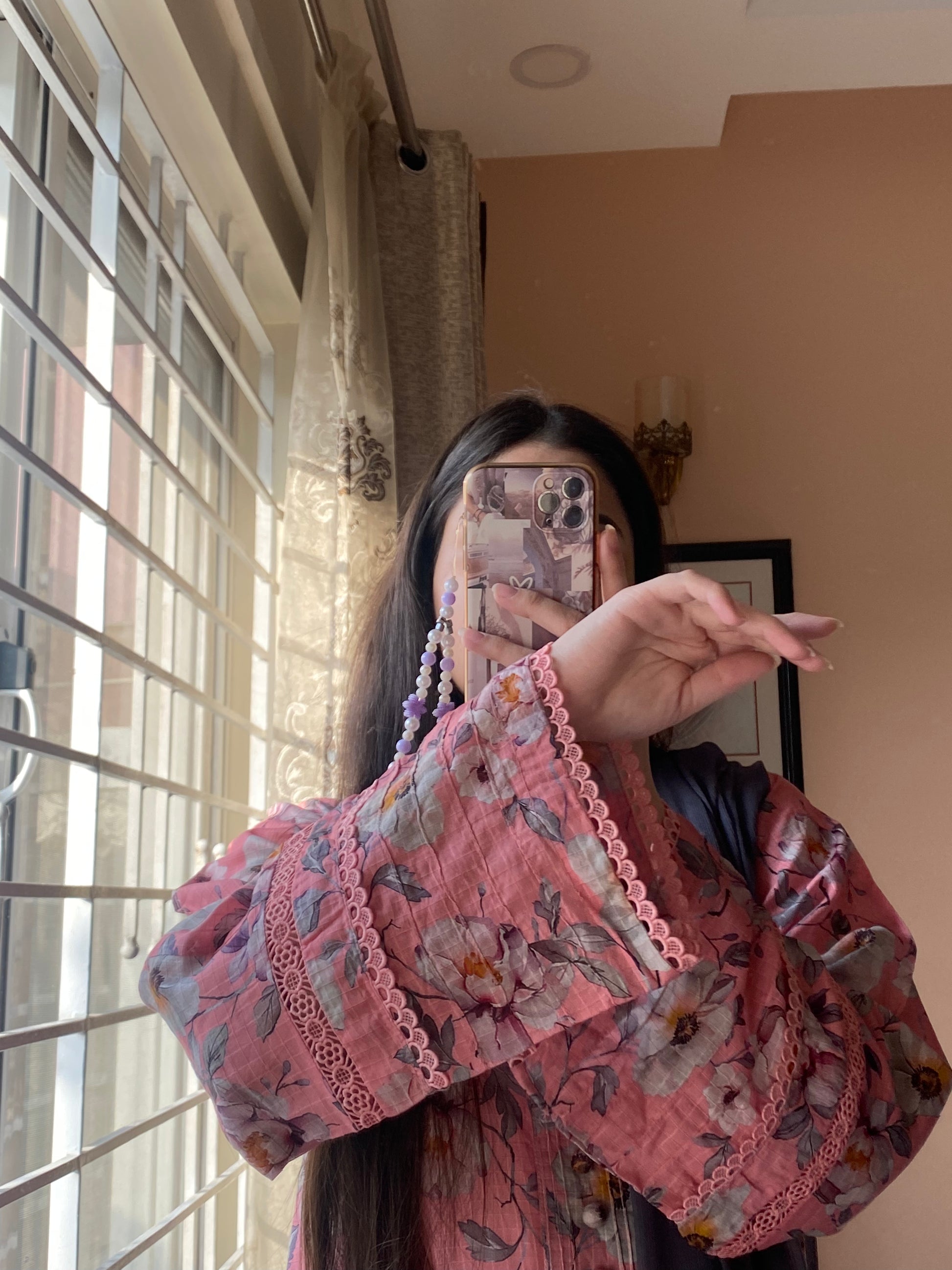 Shirt – Premium Pure Lawn Printed Shirt with elegant Neckline And Lass Work Detaling on sleeves.