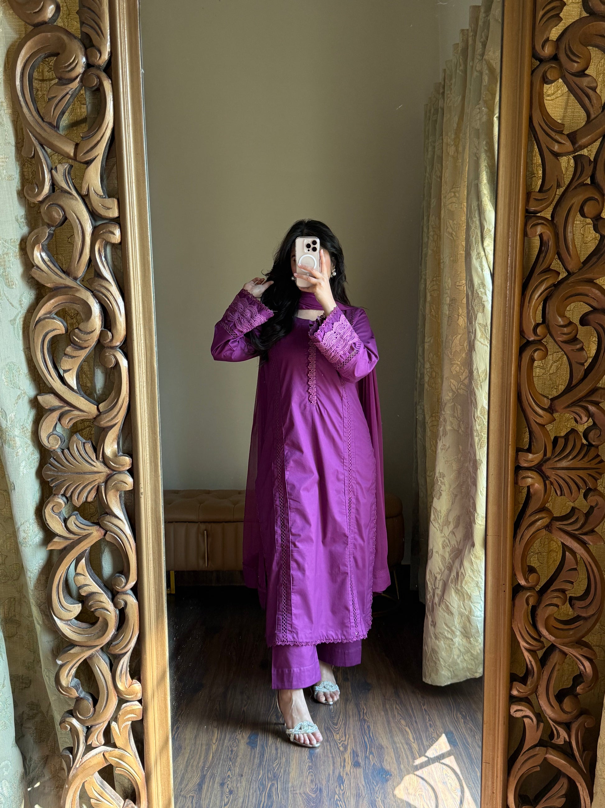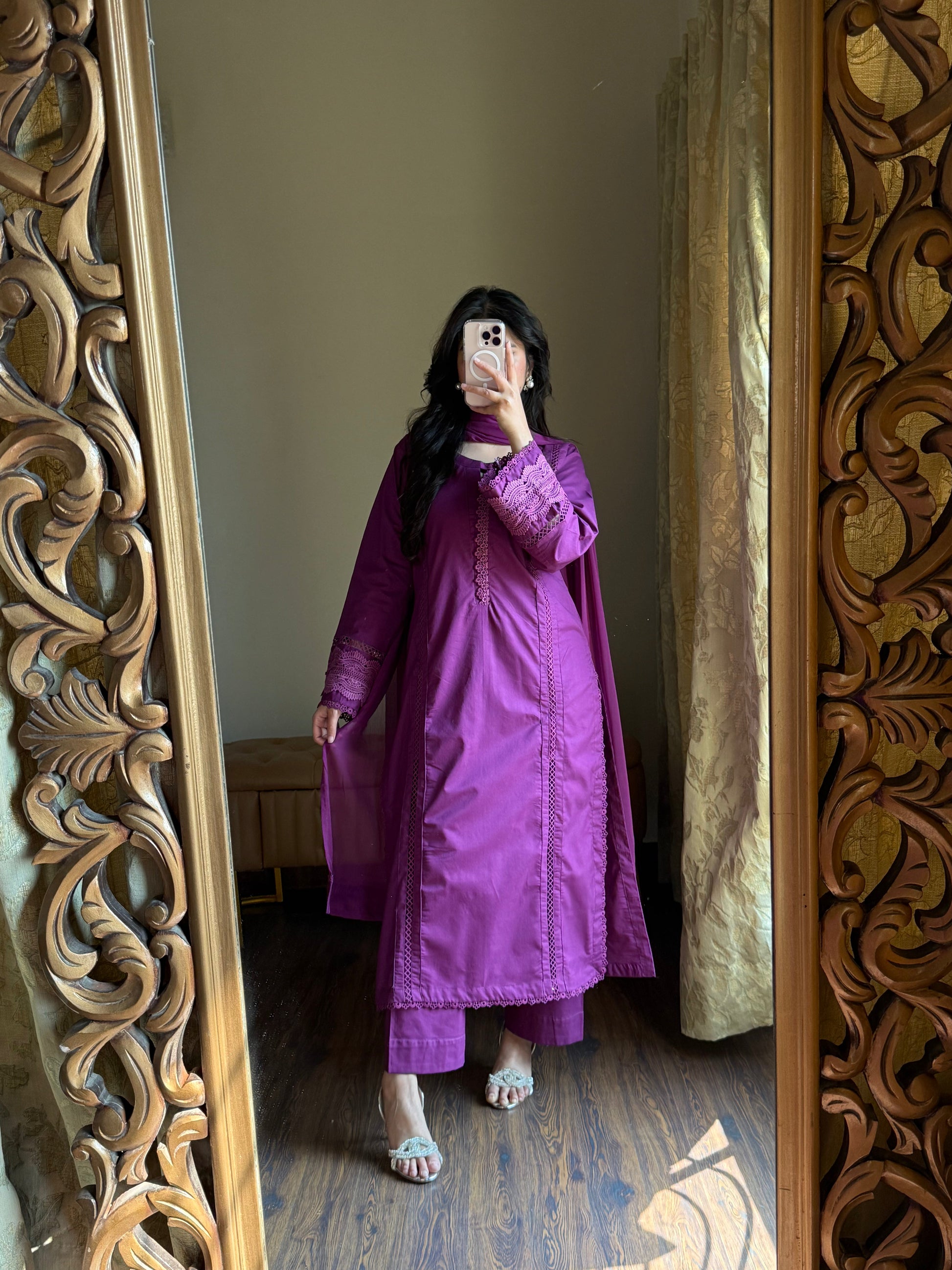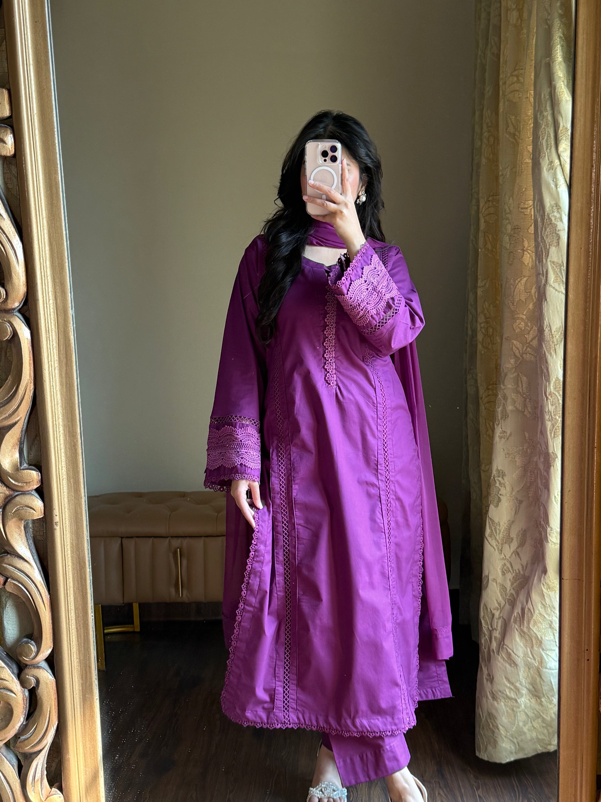 - Lightweight chiffon dupatta with lacework.