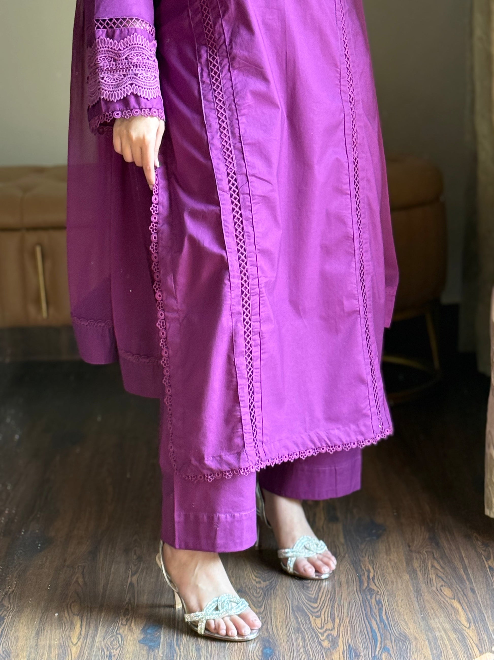 - Tailored from premium Lawn , featuring lacework on the sleeves and daman with Lasswork on the neckline for a delicate, detailed finish.