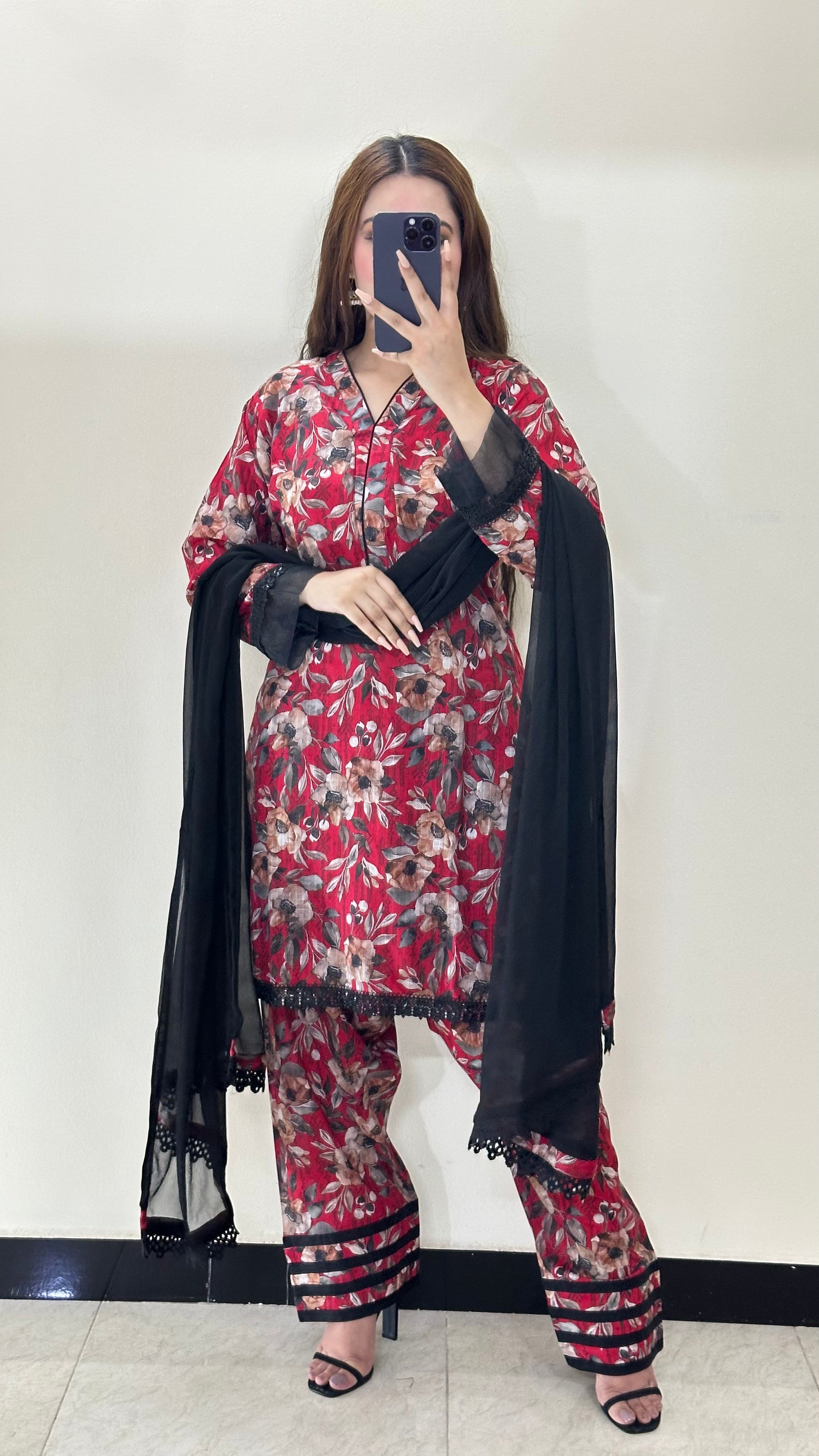 Step into timeless charm with this 3-piece ensemble, beautifully crafted in premium lawn. The printed shirt features Fancy lass detailing at the shirt border paired with a classic Farshi Shalwar that brings back the beauty of traditional silhouettes. A chiffon dupatta adorned with delicate lacework completes the look.