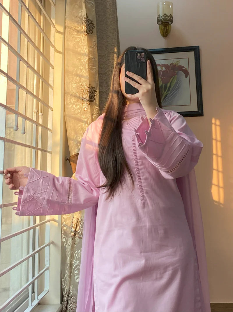 Upgrade your wardrobe with this stunning 3-piece cambric suit. The shirt boasts lace details on the sleeves and neckline, enhanced by buttons for a touch of sophistication. The straight-fit trouser offers comfort and style, while the chiffon dupatta with lacework completes the look with a delicate, feminine touch.