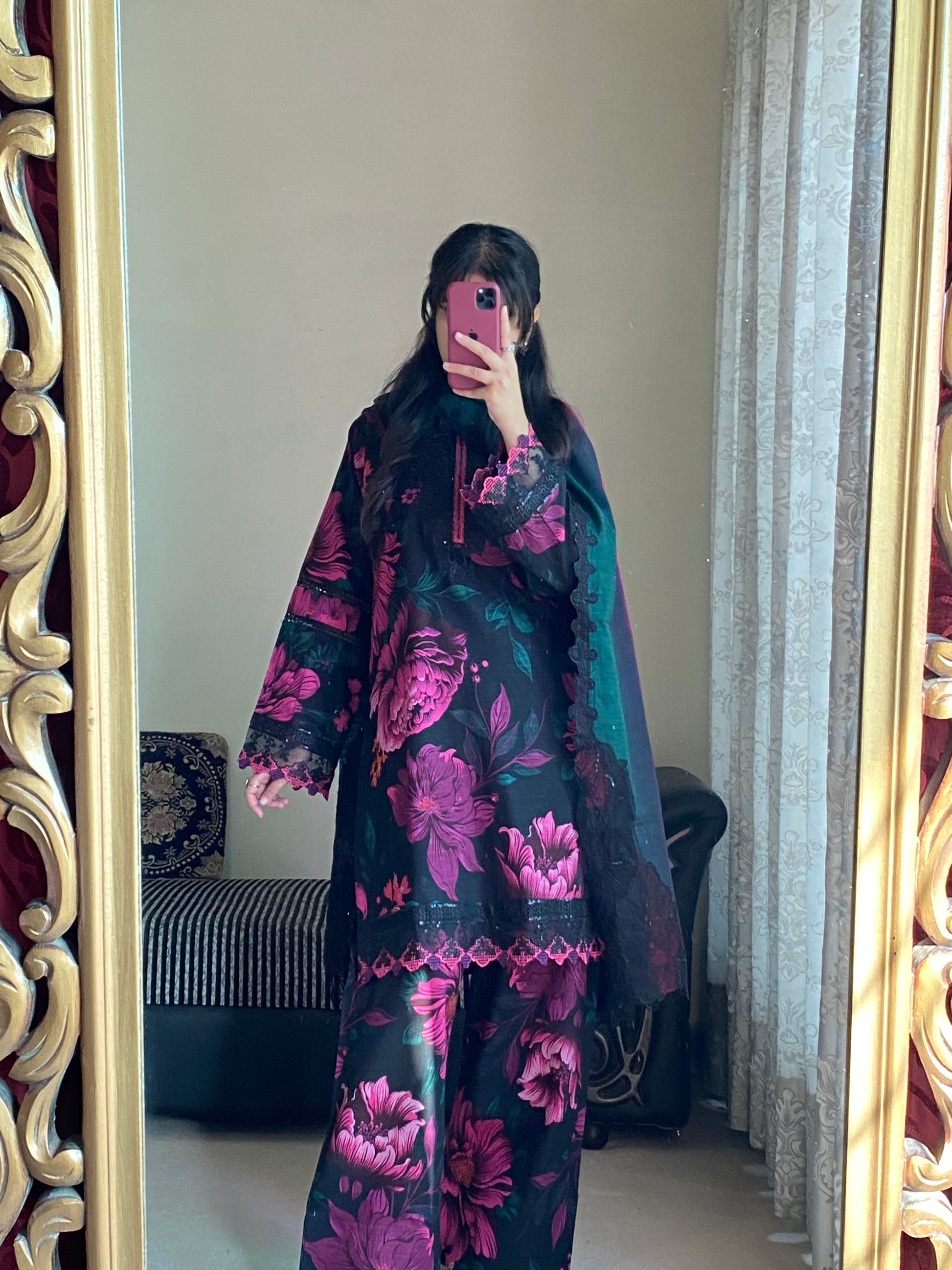 Dupatta: A beautifully finished Embroidry Shiffon dupatta adorned with lace work, adding a soft, feminine touch to the ensemble.
