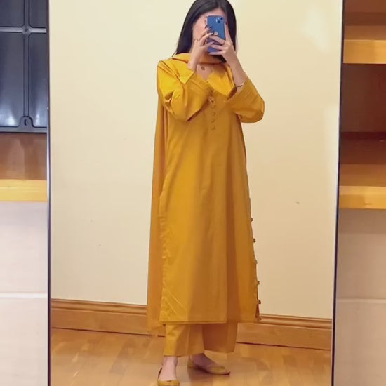 Discover timeless elegance with our Soft Karandi Dress. Featuring a beautifully detailed neckline with lace & Button detailing, this outfit exudes sophistication. The lace continues on the sleeves & Daman adding charm to the self-design khaddar fabric. Paired with tailored-fit trousers and a pure chiffon dupatta with lace accents, it's the perfect blend of style and comfort for winter.